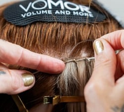 Tape-in extensions use wefts of hair with a thin adhesive strip that sandwiches around small sections of your natural hair. They sit flat against the head, which makes them one of the most seamless and natural-looking options available. Our VOMOR tape-ins have been recognized by hair loss specialists as the most lightweight tape -in extension on the market, using only medical grade adhesives.
